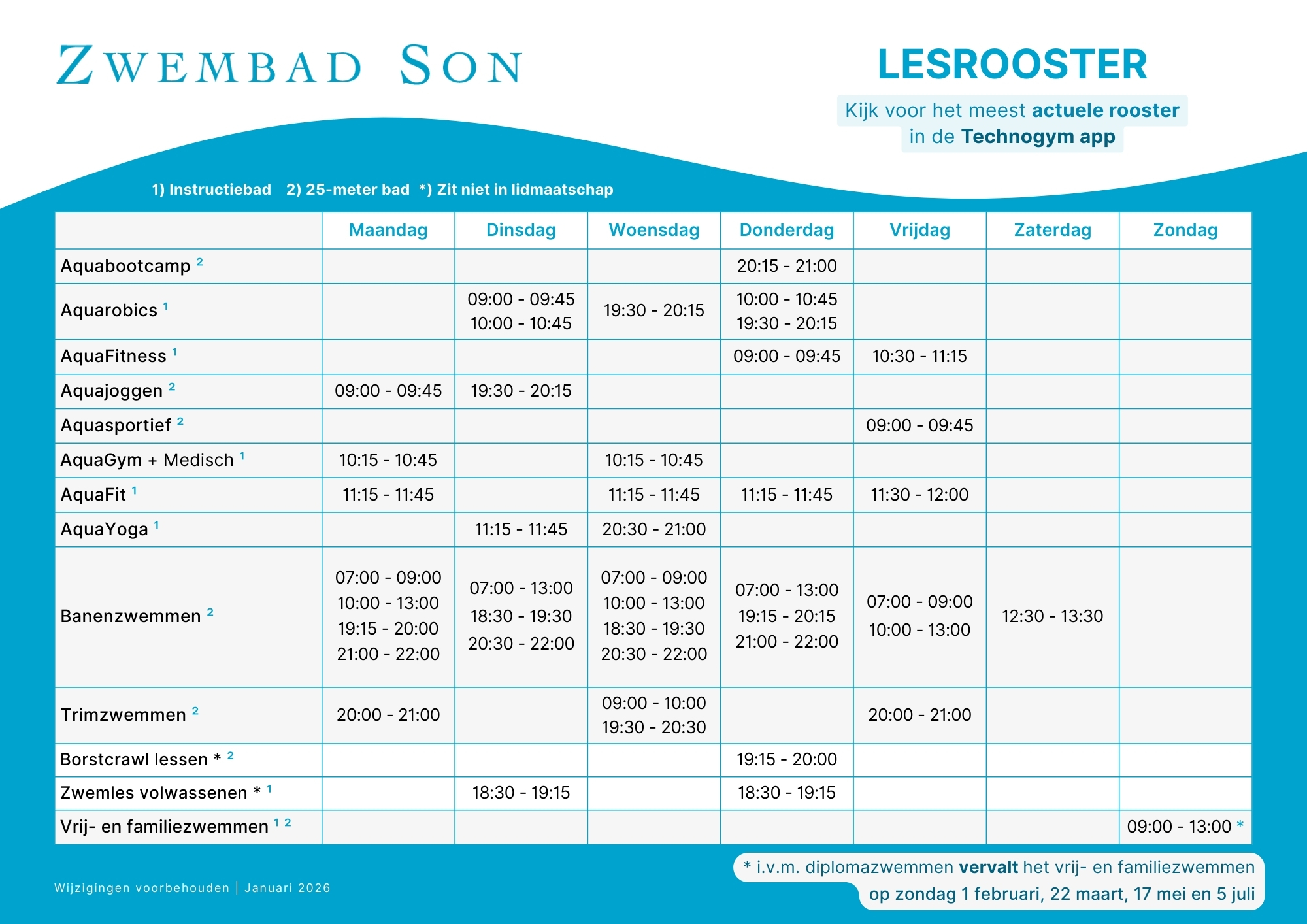 - 1 februari: diploma zwemmen kinderen die 2× per week zwemmen & diploma C